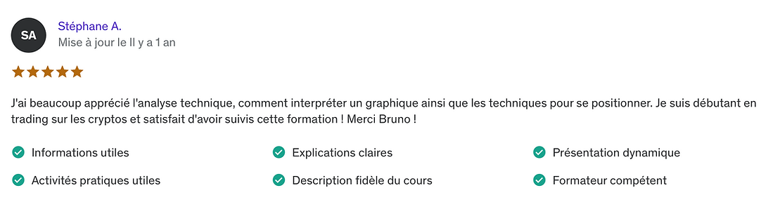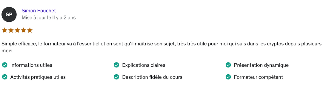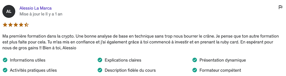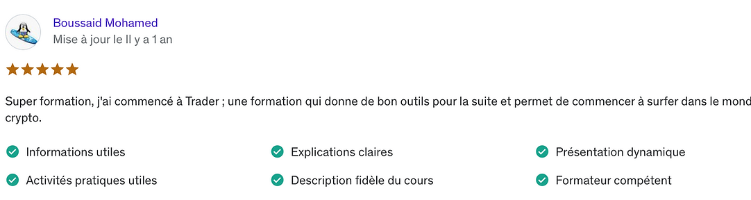Cette formation offre un apprentissage exceptionnel et les résultats des membres le prouvent. Vous avez une garantie de 14 jours si vous décidez d'abandonner vos rêves de gagner beaucoup d'argent en crypto grâce à cette formation.